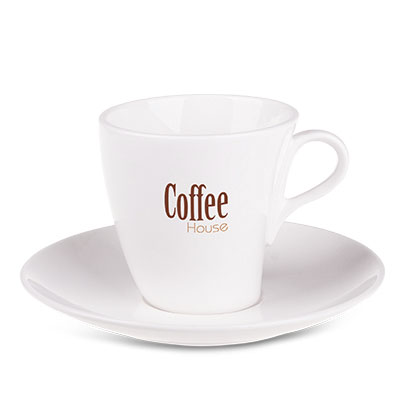 Elegancka filiżanka reklamowa o lekko pochylonej sylwetce i zgrabnym uchwycie.
